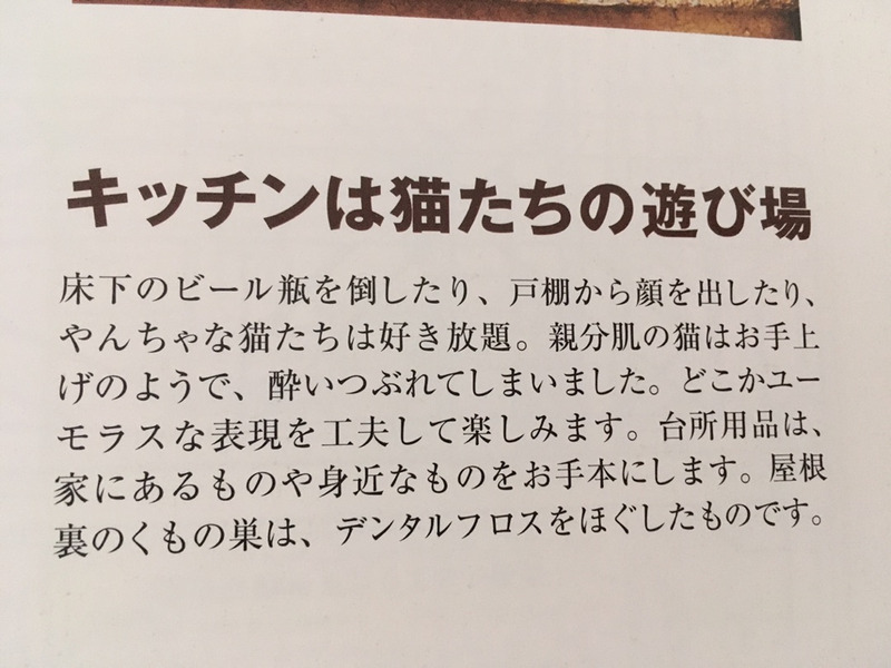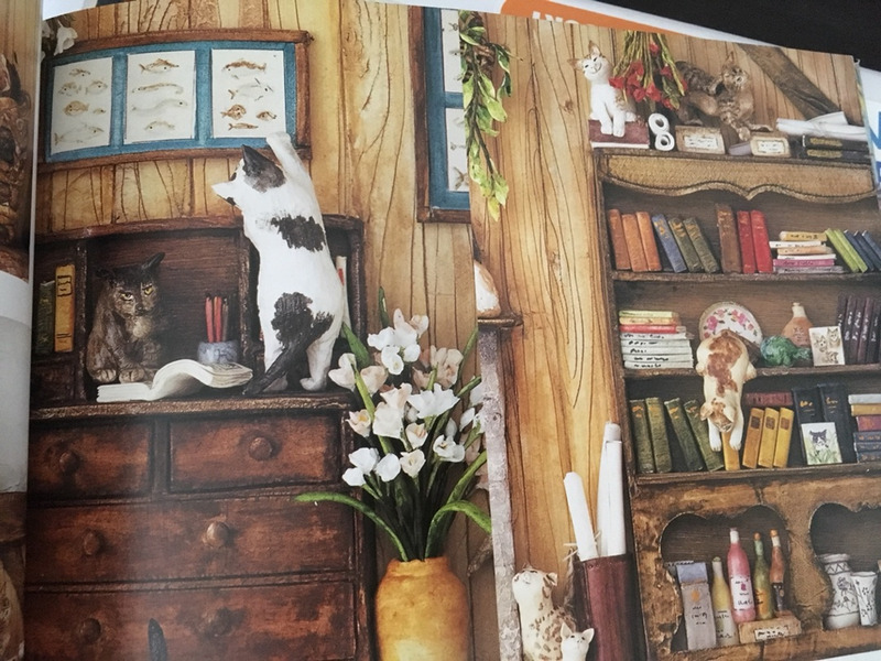 ほぼ全てのパーツを石粉粘土で彫刻して作る、ジオラマでもなければドールハウスでもない、しかしそのどちらの要素も兼ね備えている作品の製作過程を作品ごとに紹介したHow to本ですが、作例写真が多く作品集としても楽しめます。この写真を見てだいたいお分かりかもしれませんが、著者の得意なモチーフは「猫」。ただ日常のシーンを切り取るのではなく、そこに猫がいて、暮らしている風景を表現しています。
