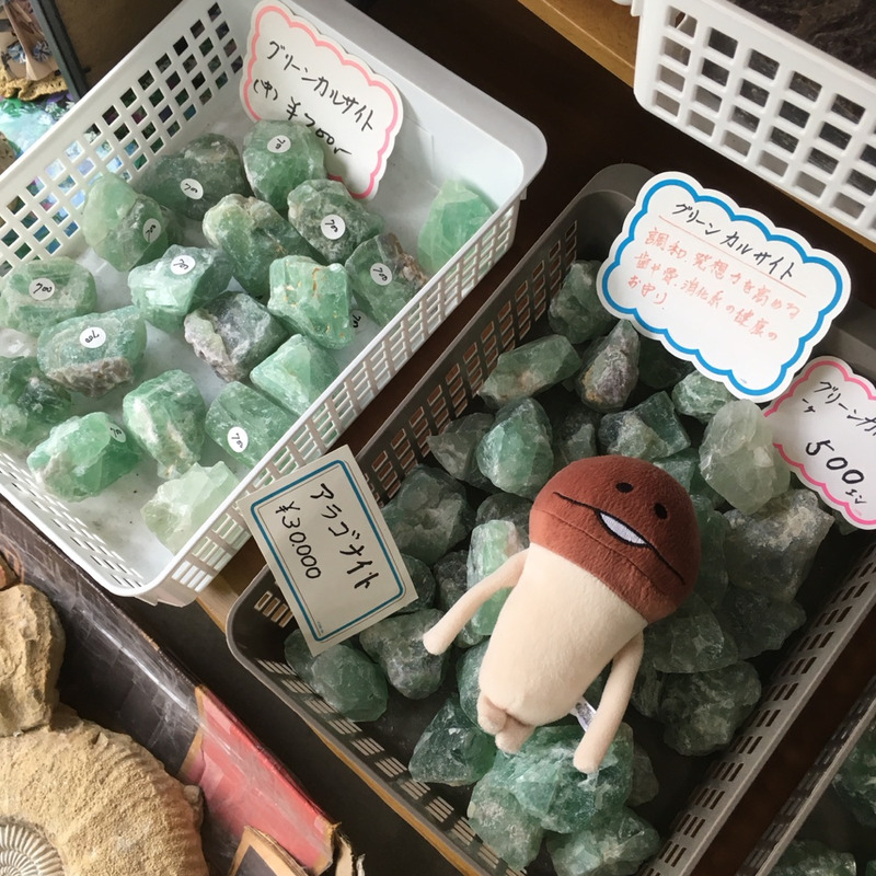 んふんふ(それにしても、数百円のグリーンカルサイトのすぐ下に無造作に3万円の化石が置かれている混沌とした店内の雰囲気がたまりません。以前秋田大学の教授が来てぶったまげて大人買いしたそうですが、まあそうだろうなあ…という品ぞろえの豊富さ。また東京から来た観光客に「こんな貴重なものをただ置いておくのは危険ですよ!鍵付きのガラスケースに入れておかないと!」とアドバイスされたそうですが、設備費がかかるのでそのような施策はしていないとか。でも、こうして実際に見て触れられる手軽さがまた良いのかもしれません。)