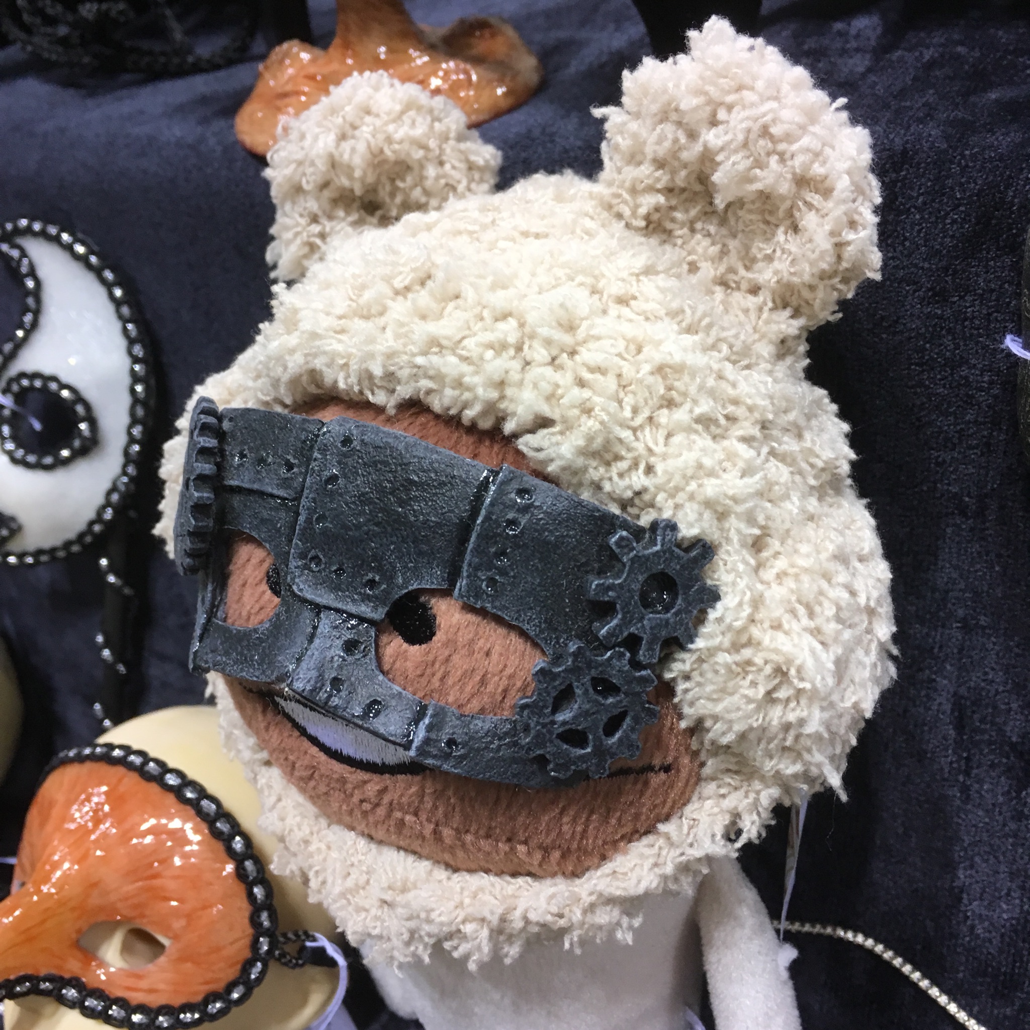 お隣のスペースの方がドール用の帽子を販売していらしたので、なめこに試着させてみたらこれがピッタリ!ということで購入後すぐに着せ、もこもこ帽子とスチームパンク仮面という謎のコーディネートで仮面のモデルをやらせました。