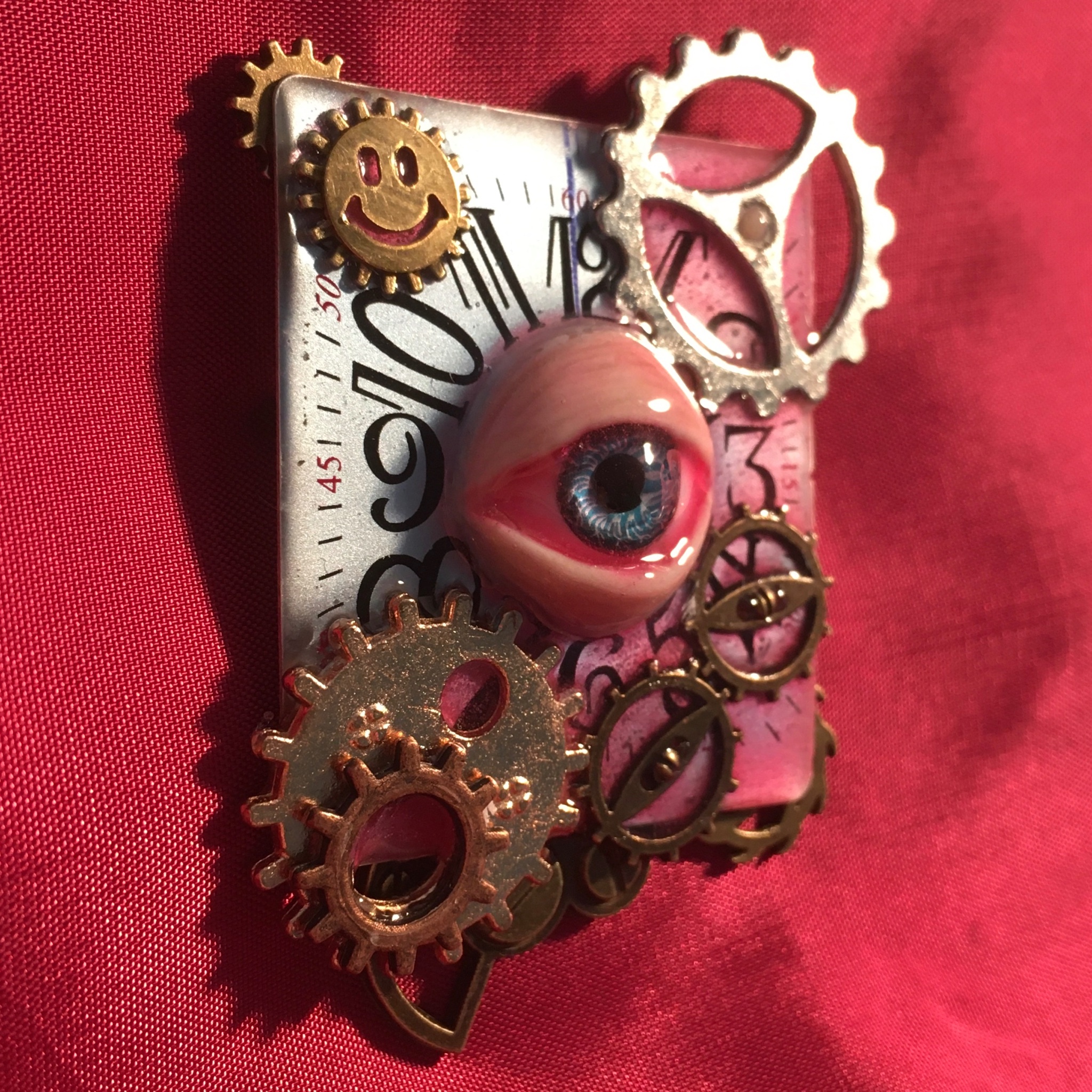 イメージ的に銅と真鍮でできた仮面という感じに塗装しました。実際の材質はアルミとニッケルと石粉粘土ですが。そこはアクリル絵の具の塗装の妙というもの。