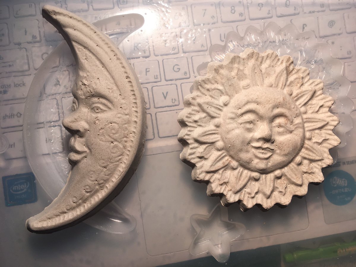先日実験のために使用した太陽と月のオーナメントから型が外れました。木粉粘土を混ぜたため石粉粘土よりも乾くのが遅くなりましたが、一方で軽量化に成功。また木粉粘土の弾力も加わったので破損の危険性も弱まりました。