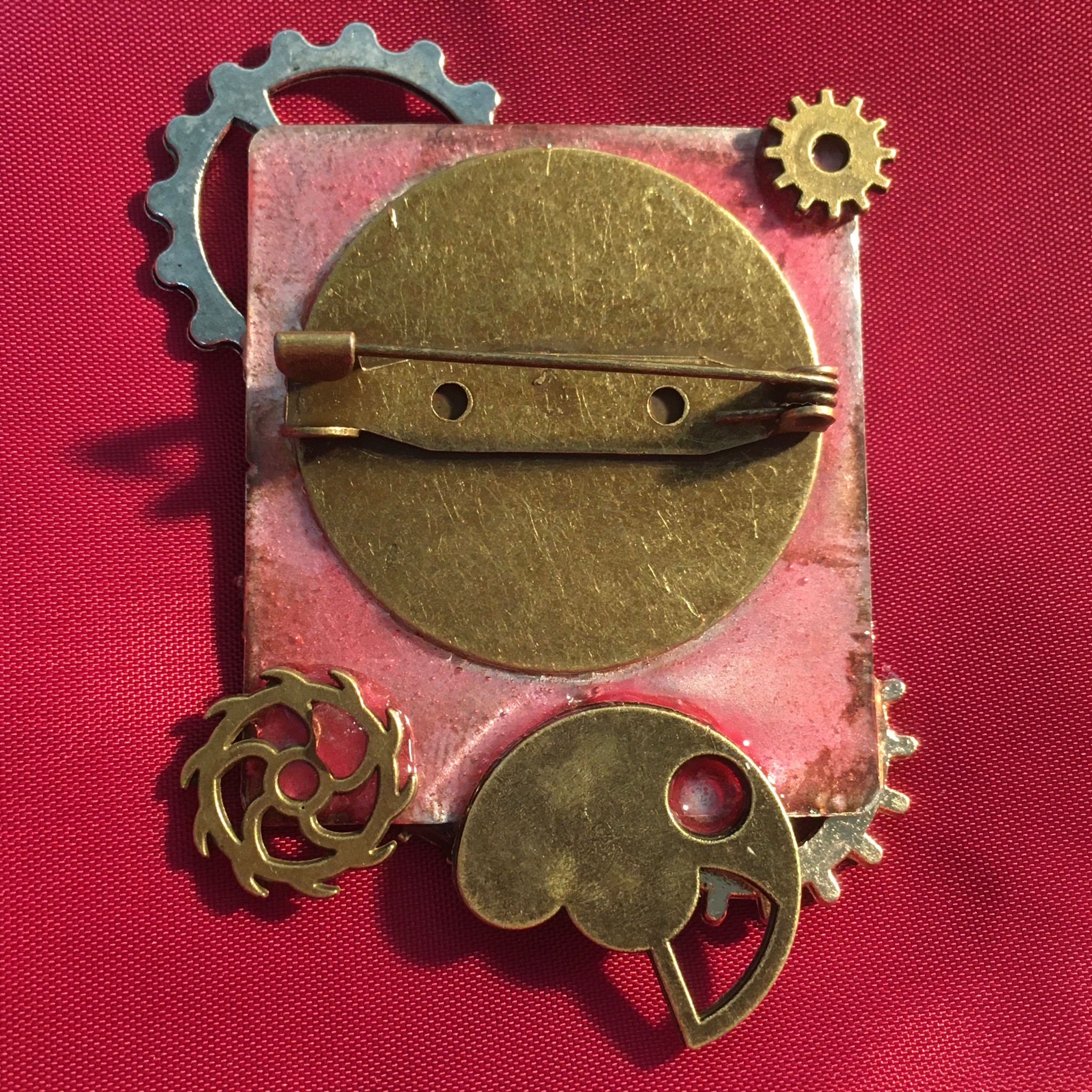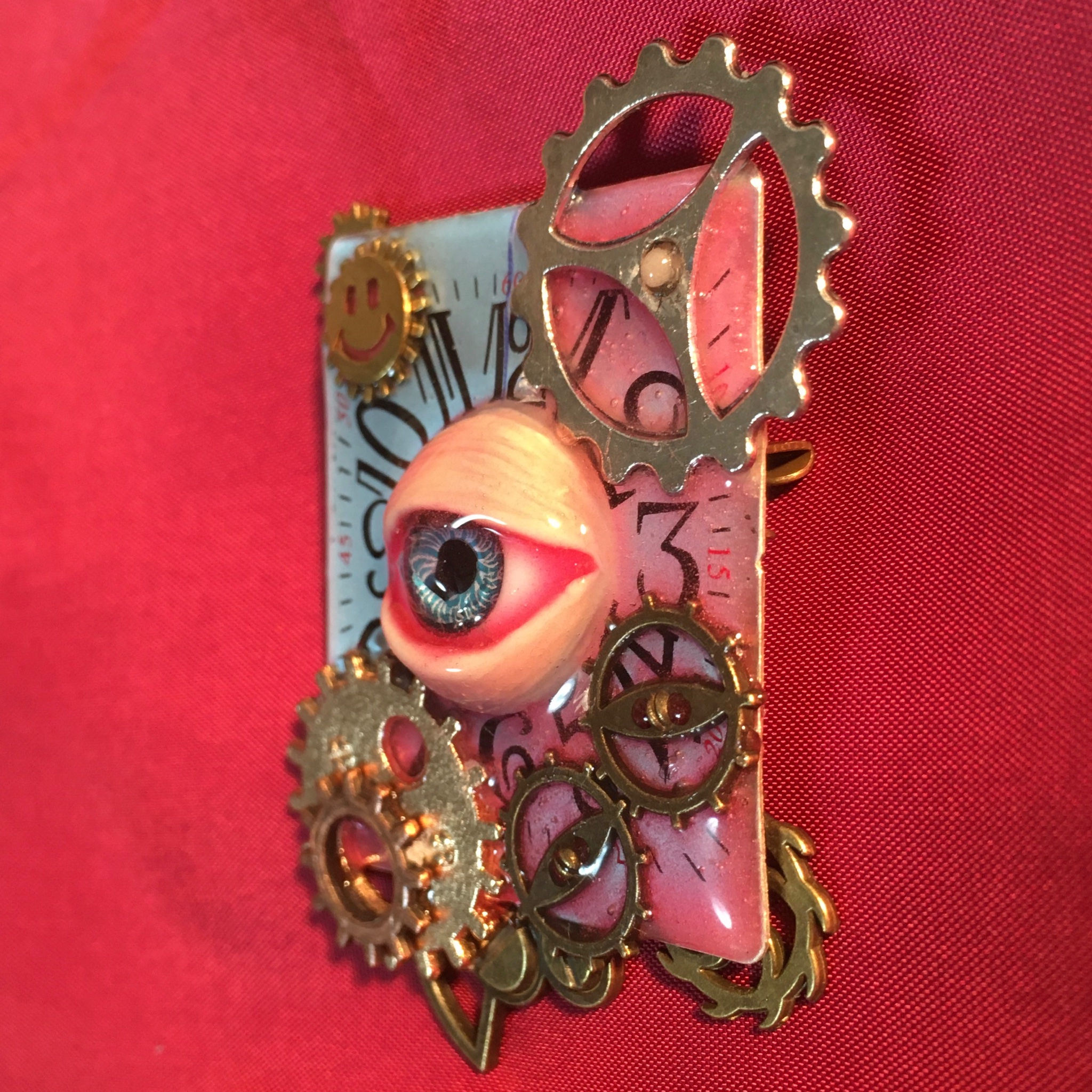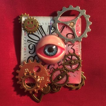 ベースには本物の時計の文字盤を使用しています。ブローチの土台になるなんて余程大きな腕時計だったのでしょう。しかもスクエア型。縦に長いタイプだったのでそのまま使用し、様々なメッキ色の歯車パーツなどで装飾し、中央には瞼付きの義眼を貼りました。パーツを大盤振る舞いしていますが、重量はそれほどでもありません。