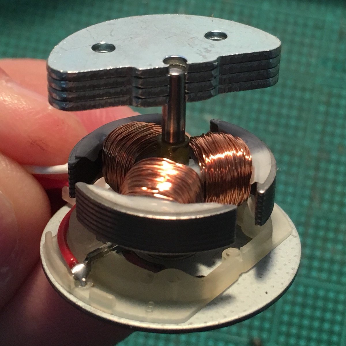 モーター分解。そして故障原因特定。コイルとの接触パーツの錆。コイルの銅線はコーティングしてあるちょっと良いやつだったので腐食なし。