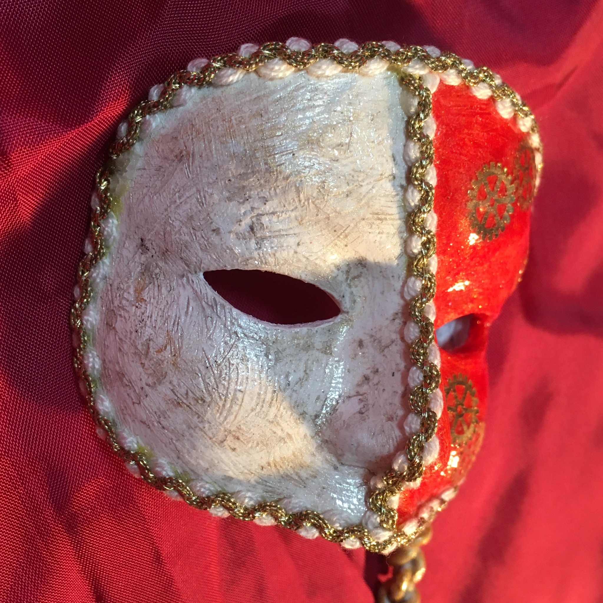 レジン封入用やネイルアート用に極薄の歯車パーツが売られていたので、それをアクリル絵の具のクリスタルバーニッシュを使用し仮面の表面に塗り込めた持ち手付きのドール用仮面です。これもワンフェスに合わせた完全新作です。