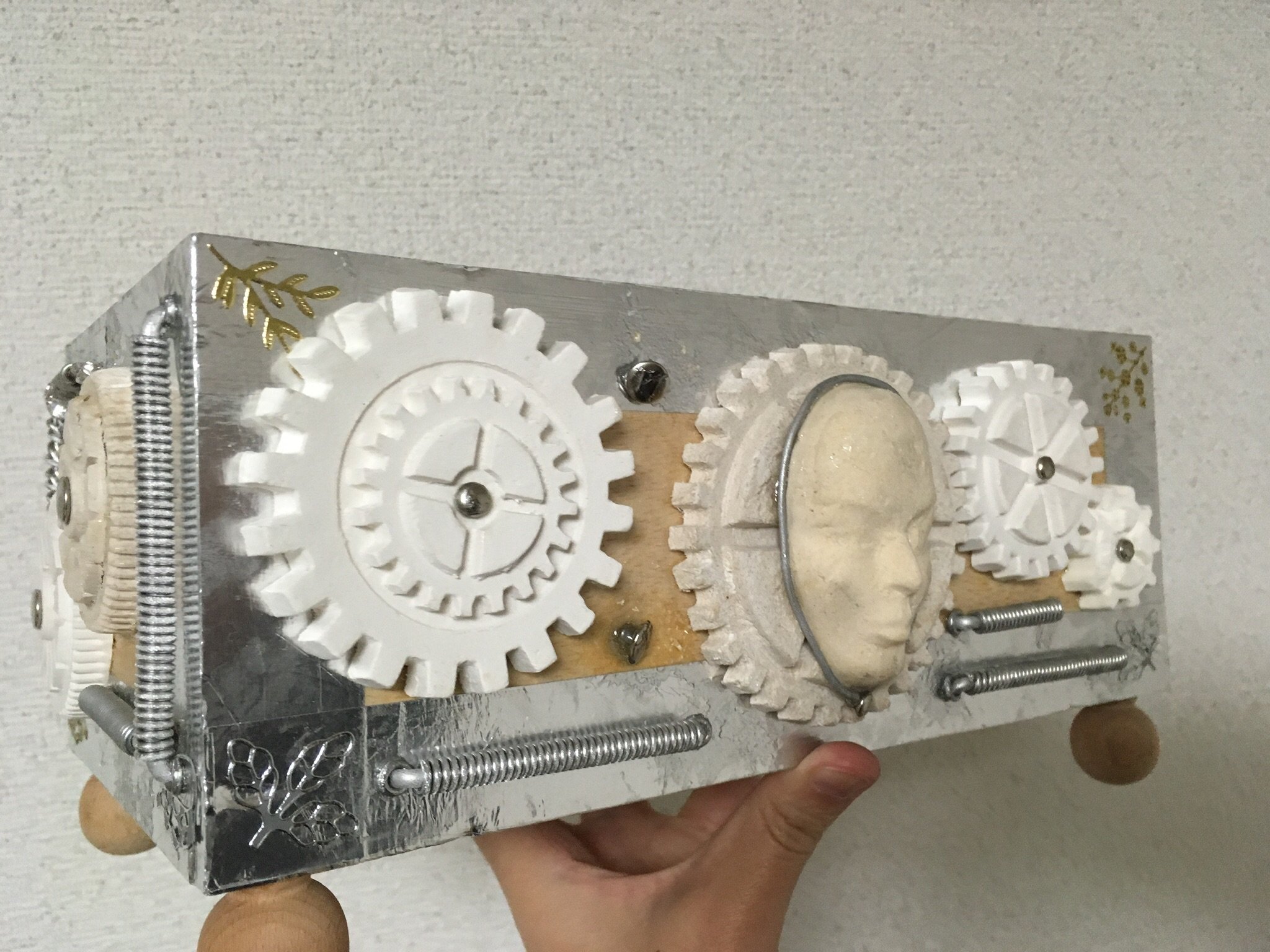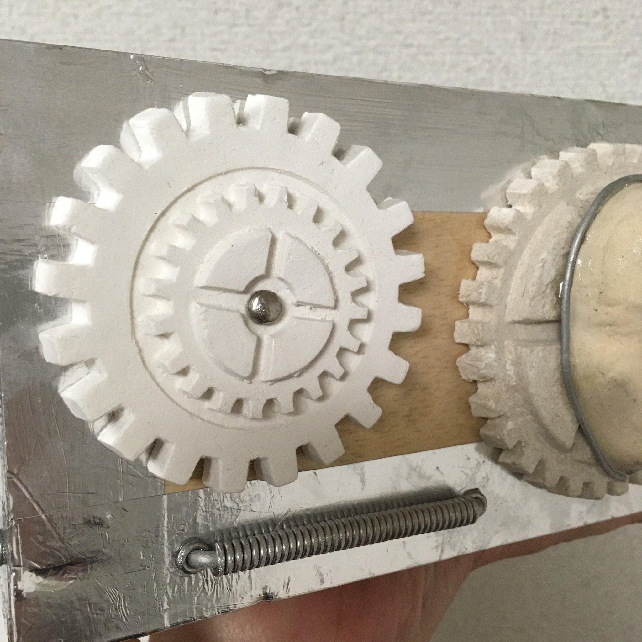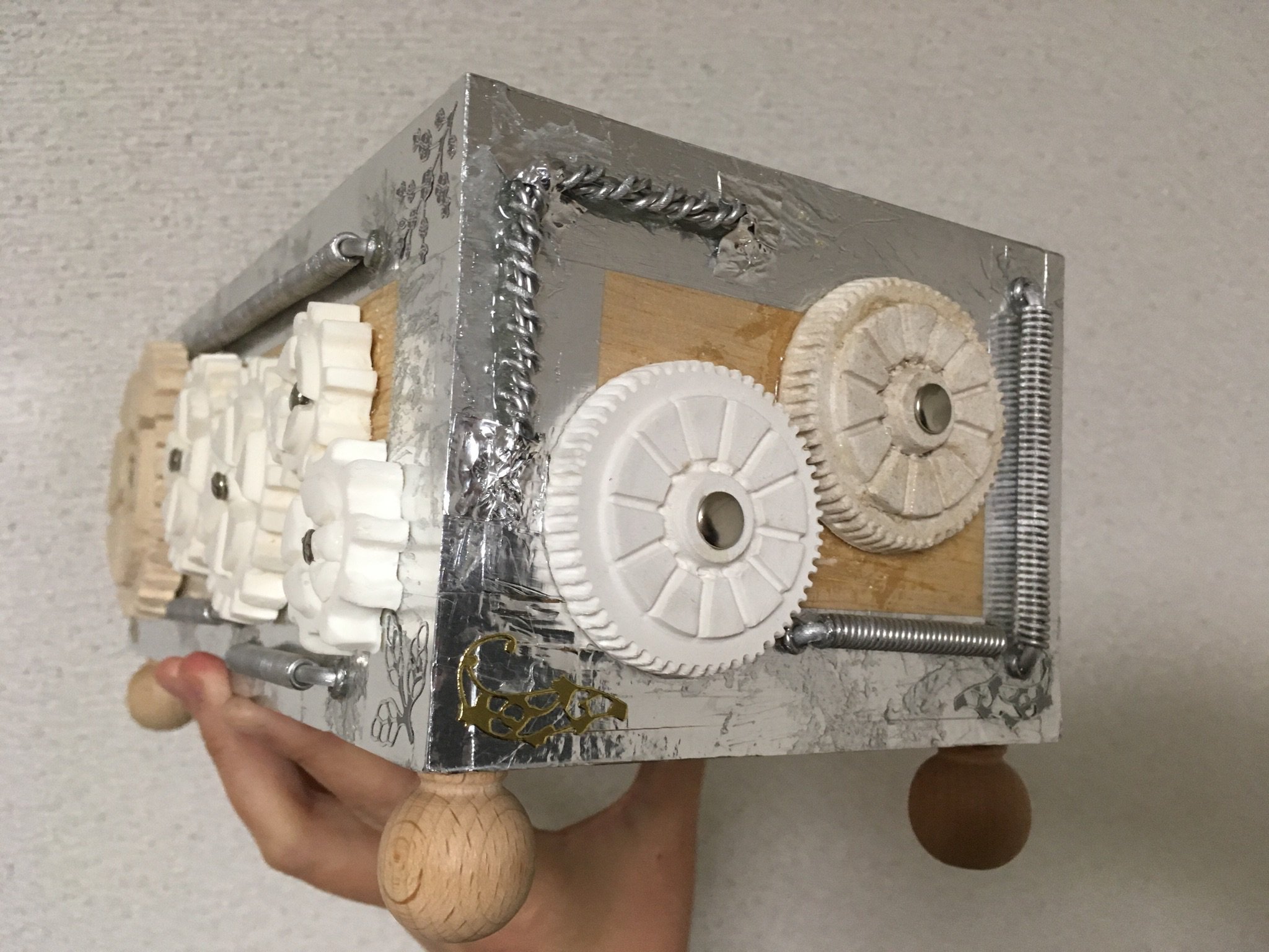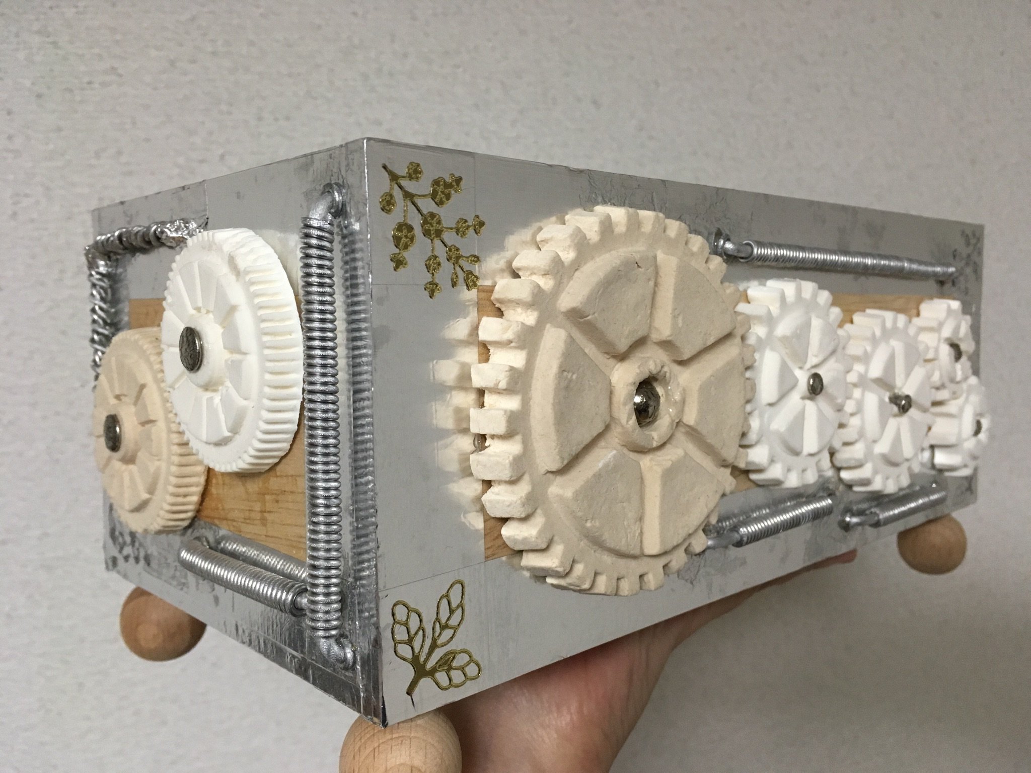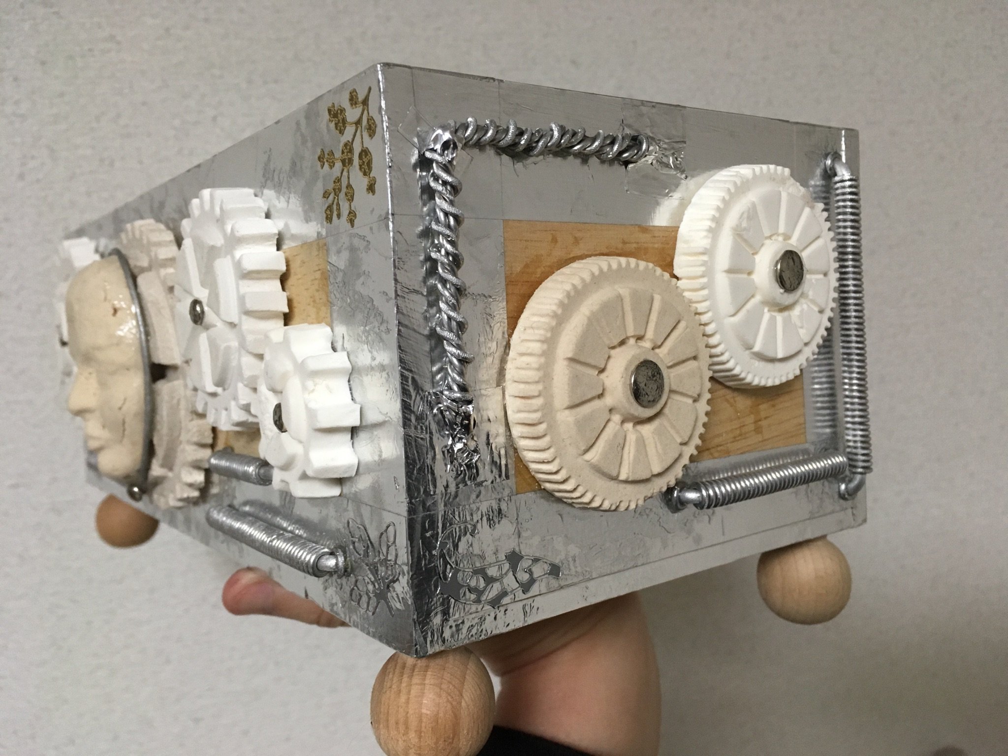 箱の装飾パーツが足りなくなったのでまた作り足しました。アルミ線でコイルを作るのはすぐできてよいのですが、粘土で歯車を作るのは乾くまで待たなければならないので面倒です。