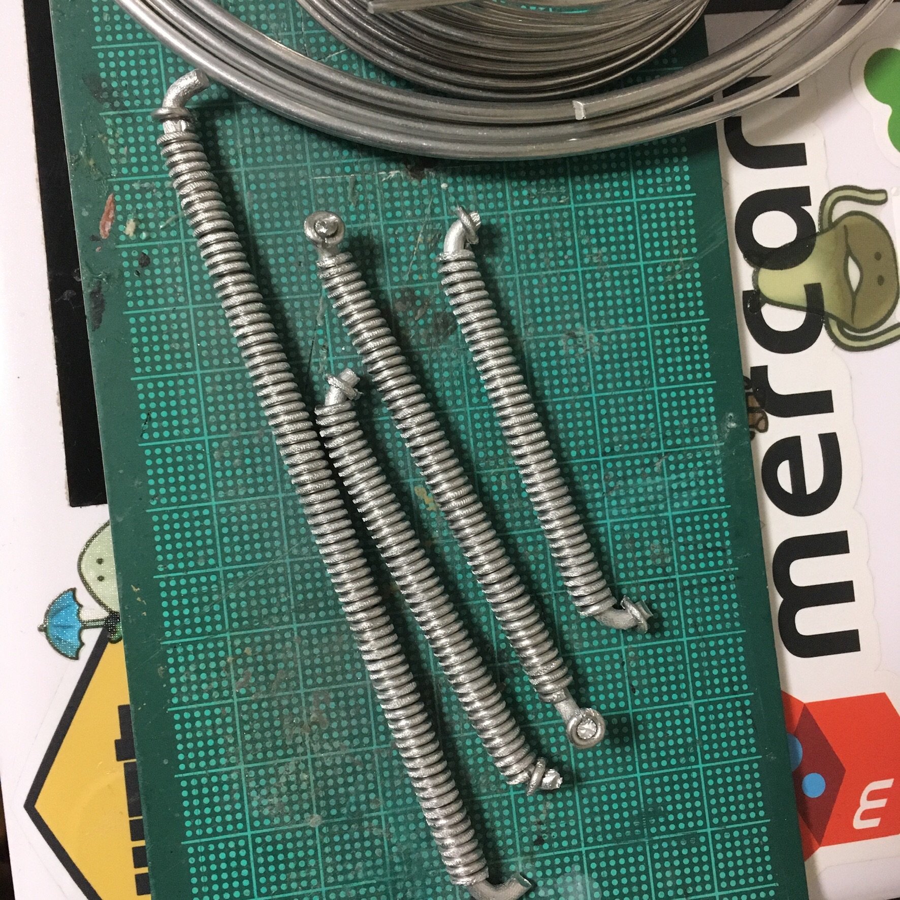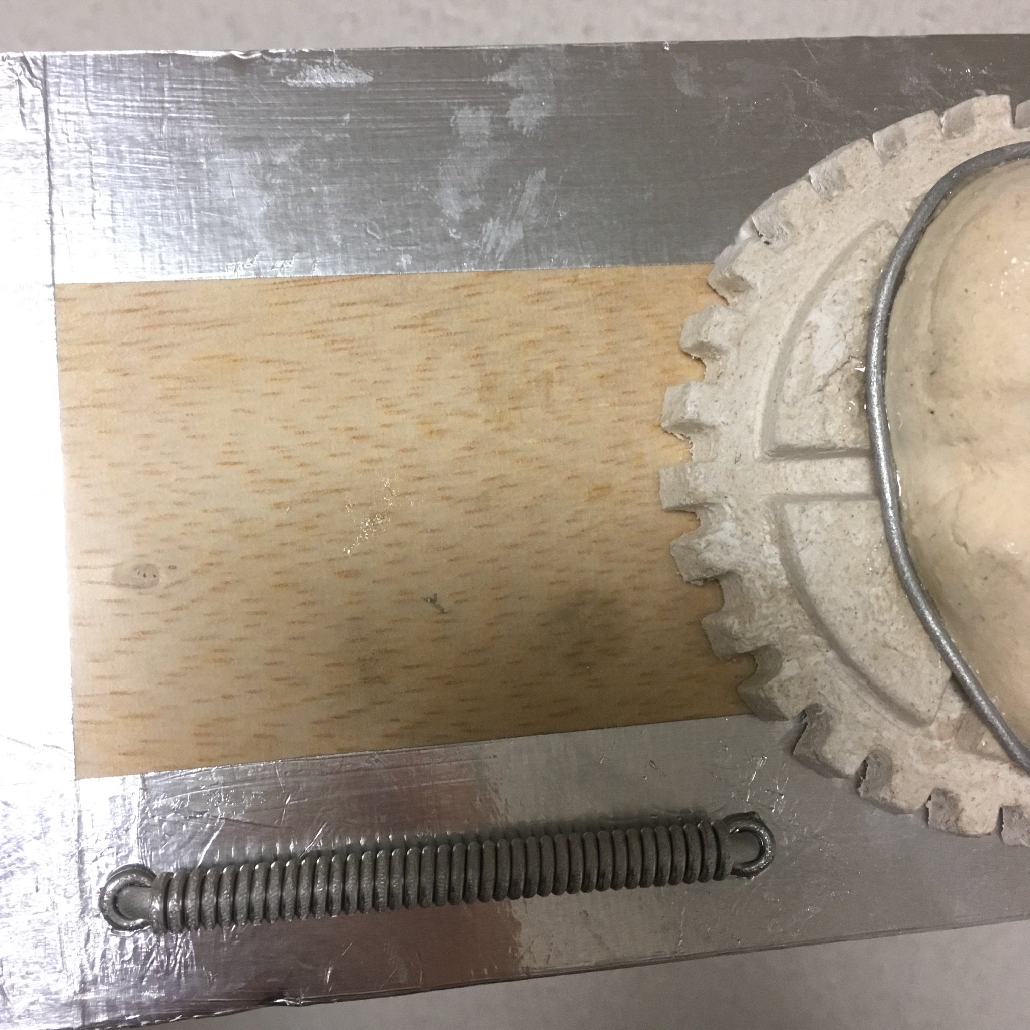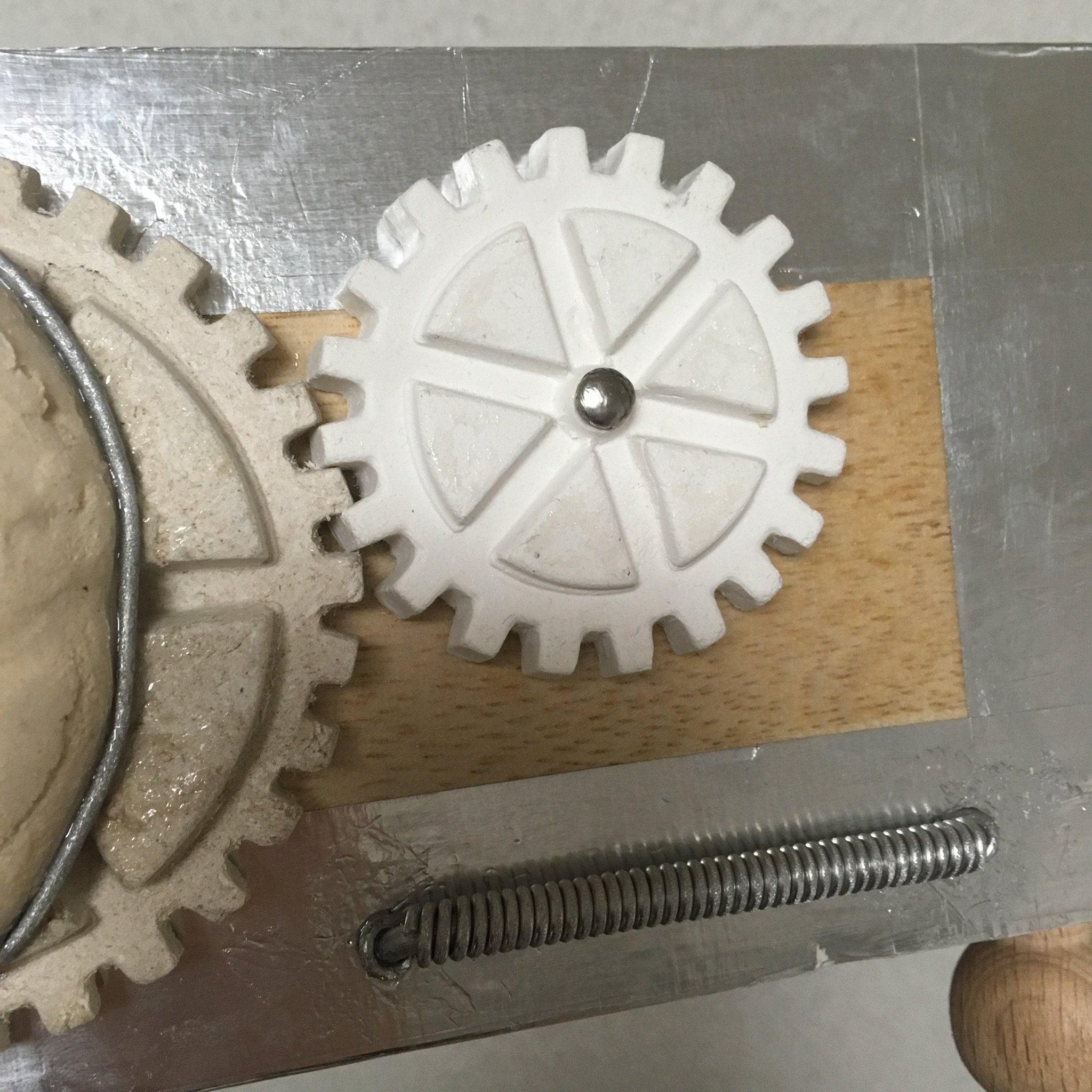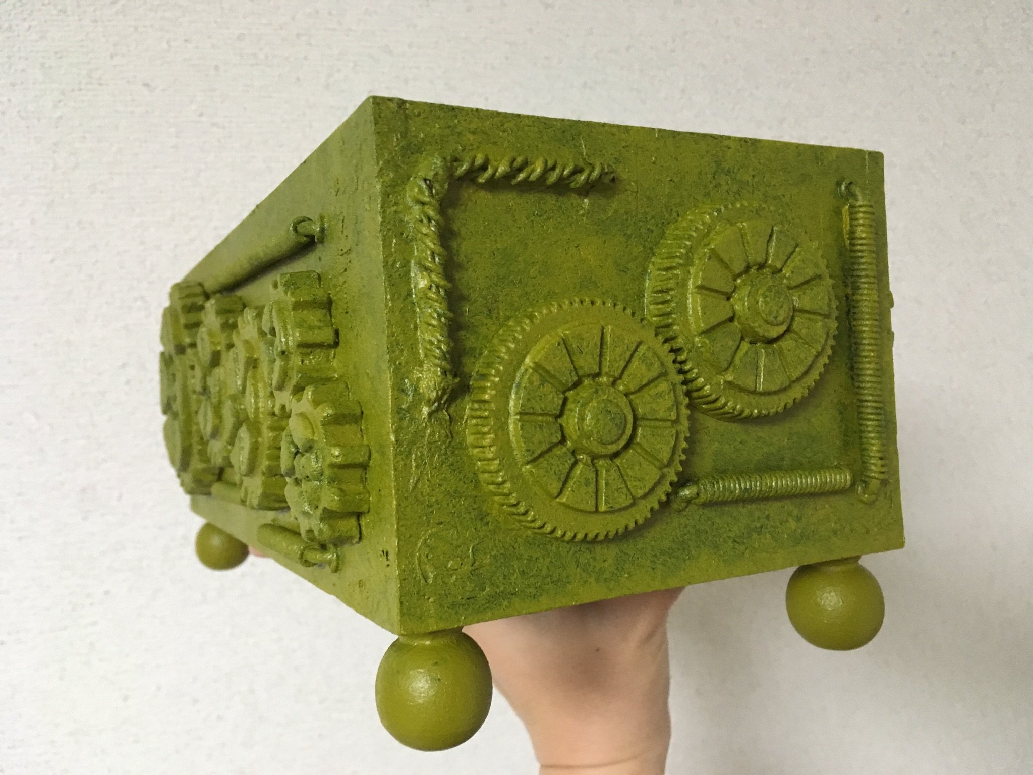 箱の装飾パーツが足りなくなったのでまた作り足しました。アルミ線でコイルを作るのはすぐできてよいのですが、粘土で歯車を作るのは乾くまで待たなければならないので面倒です。