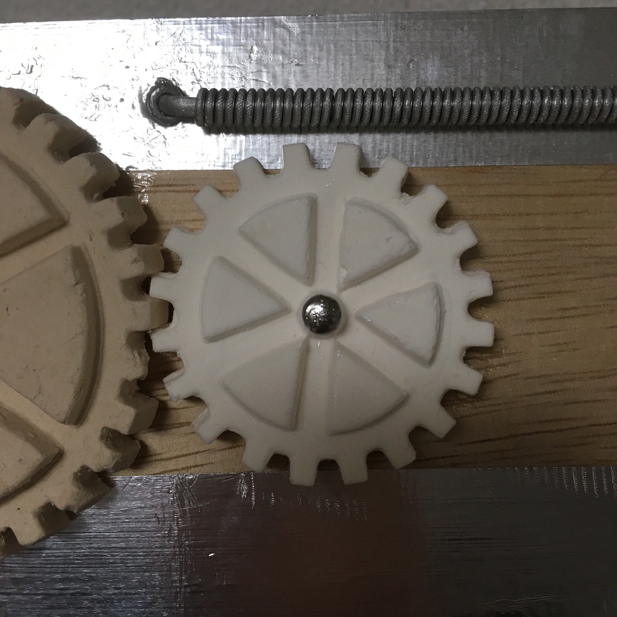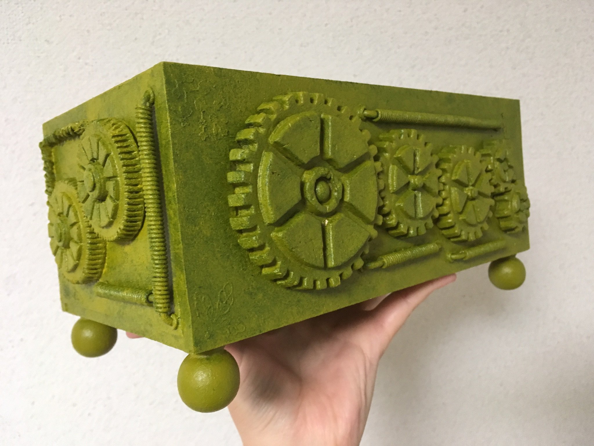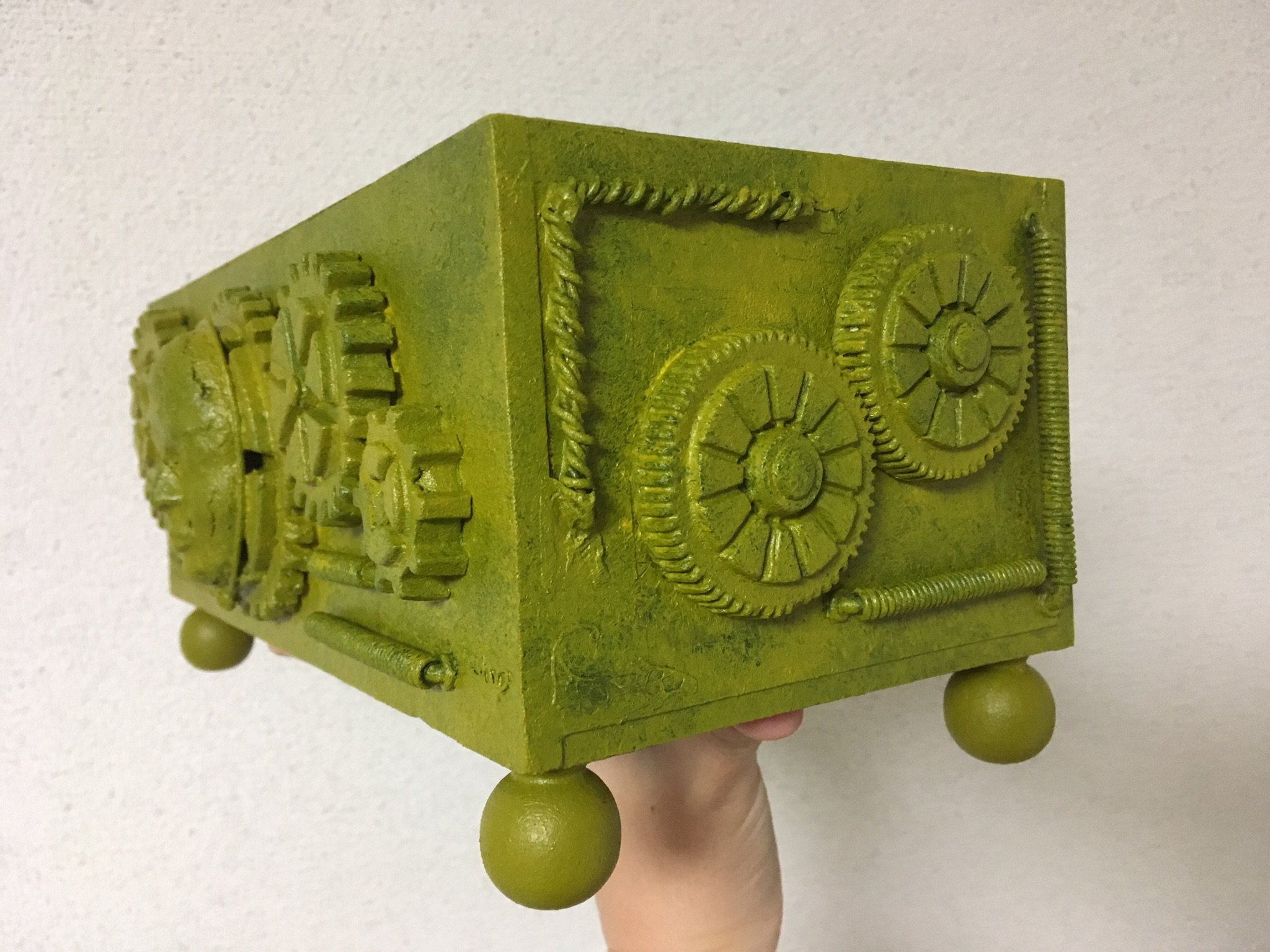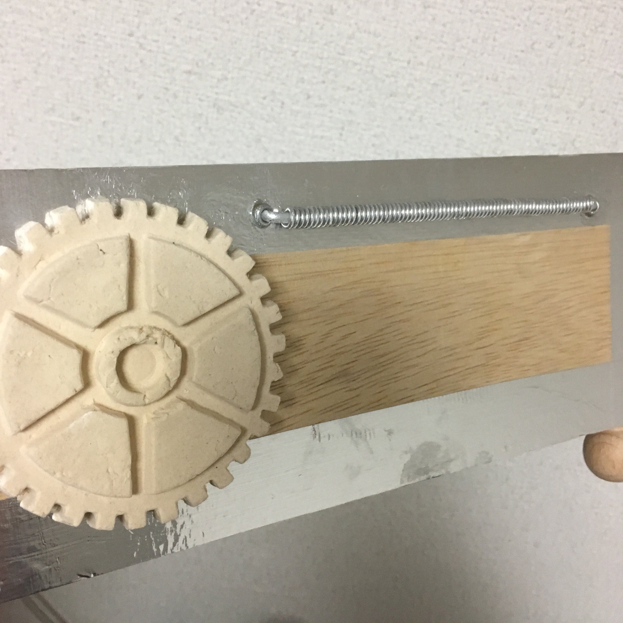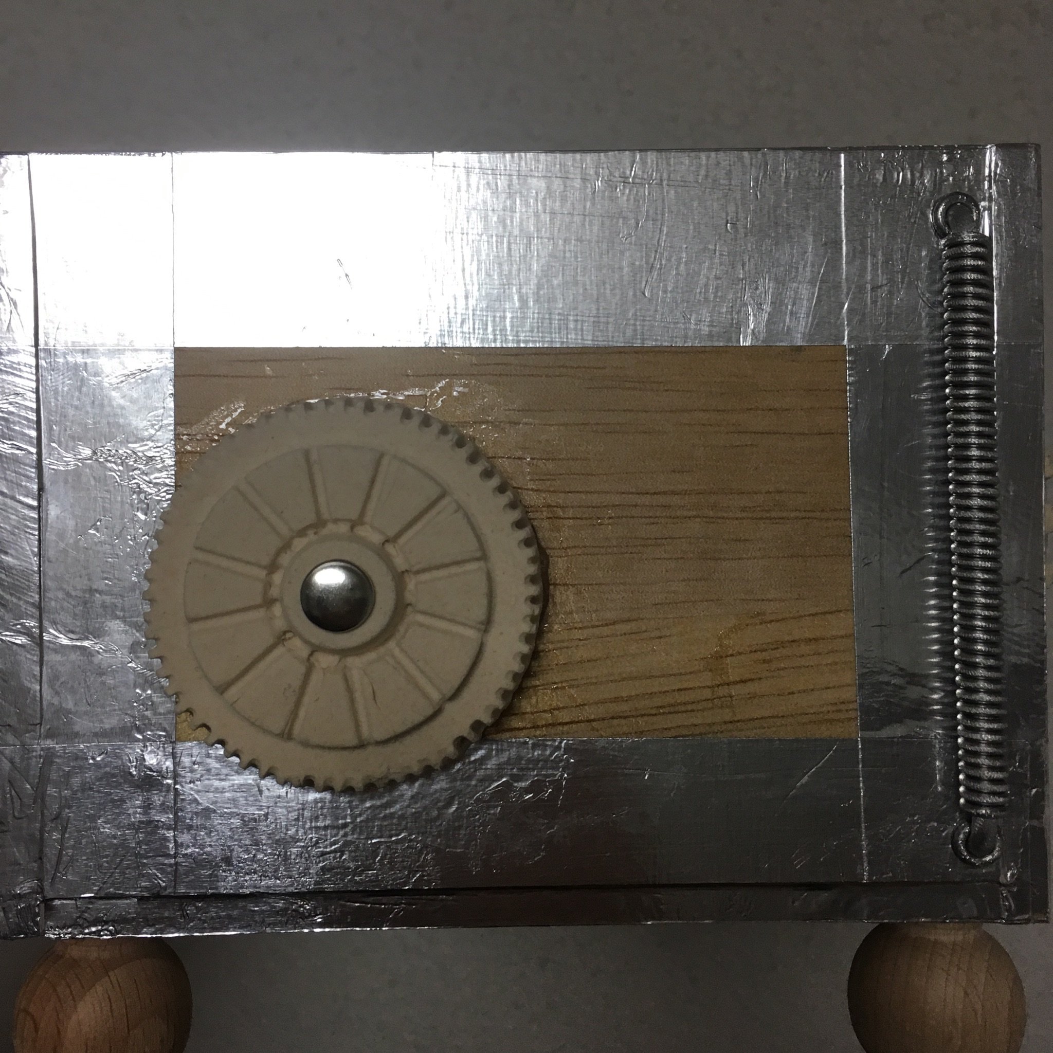 箱の装飾パーツが足りなくなったのでまた作り足しました。アルミ線でコイルを作るのはすぐできてよいのですが、粘土で歯車を作るのは乾くまで待たなければならないので面倒です。