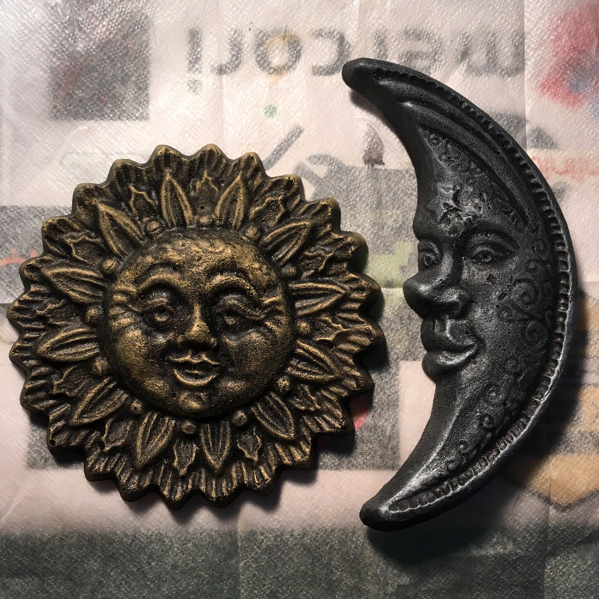 先日実験のために使用した太陽と月のオーナメントから型が外れました。木粉粘土を混ぜたため石粉粘土よりも乾くのが遅くなりましたが、一方で軽量化に成功。また木粉粘土の弾力も加わったので破損の危険性も弱まりました。
